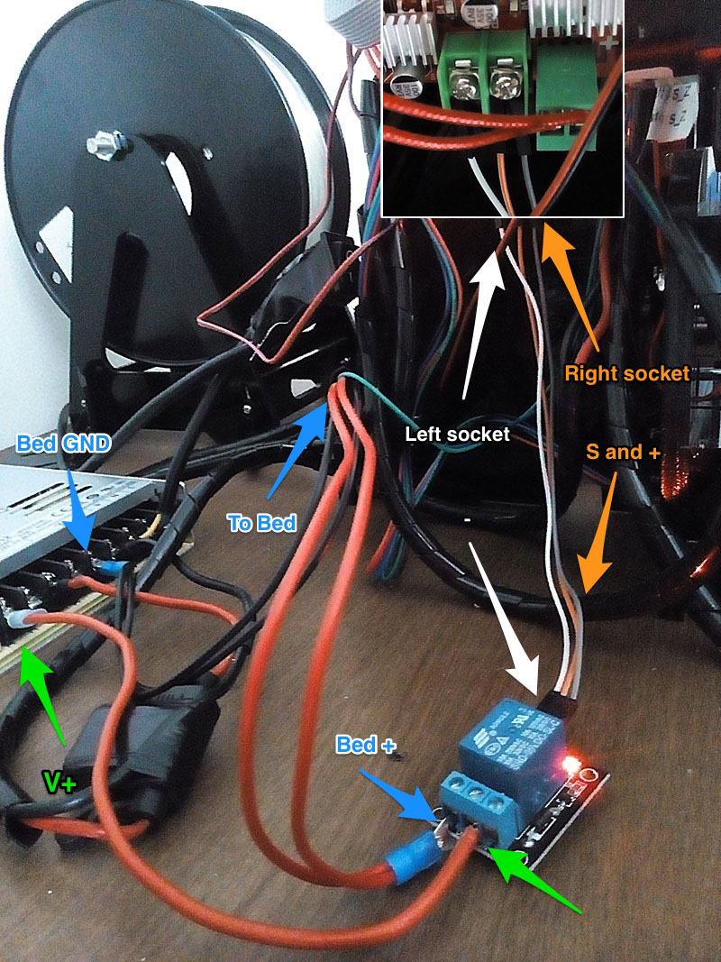 Bed est le lit chauffant. Le câble rouge se connecte au +, le câble noir au -.