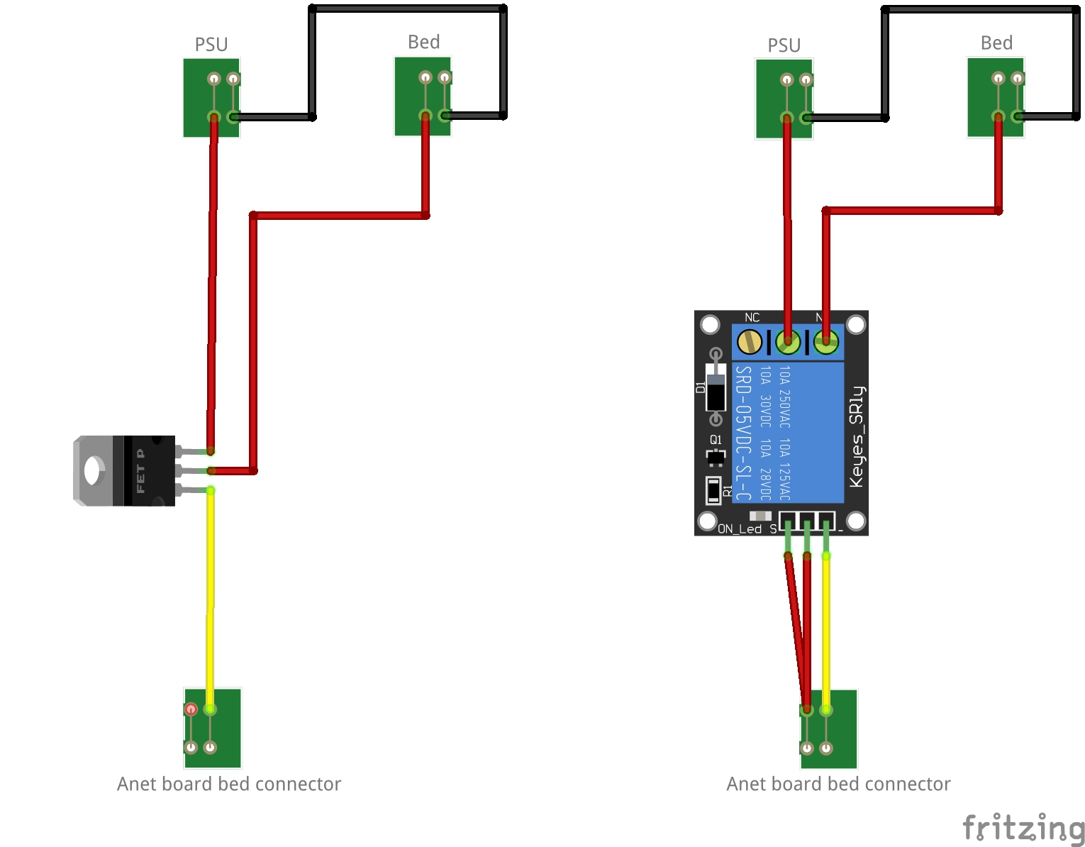 Alors, comment résoudre ce problème pour 5€ ? L'idée est simple : alimenter le lit directement et utiliser la carte de contrôle de l'Anet A8 comme interrupteur. Ce que nous pouvons réaliser avec un relai ou, mieux, avec un MOSFET.